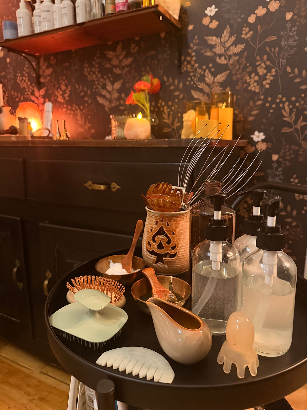 Next came a liquid exfoliation, carefully applied to dissolve buildup. This was followed by a customized herbal hair tea, infused with essential oils and thoughtfully selected to nourish the scalp and support overall hair health. She paired this with a scalp exfoliation brush to further refine and invigorate, and every step just felt better than the last.